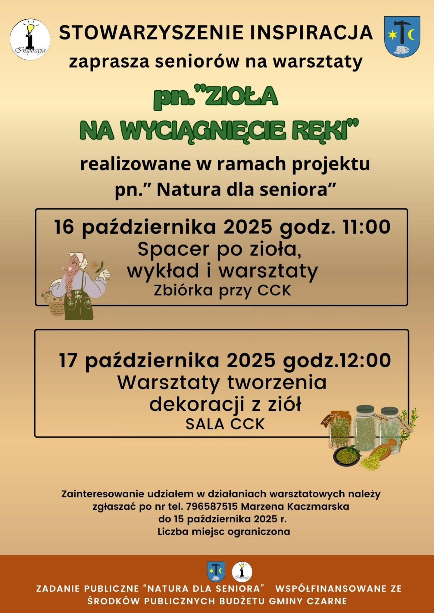 Stowarzyszenie Inspiracja zaprasza seniorów z gminy Czarne na cykl warsztatów „Zioła na wyciągnięcie ręki”, organizowanych w ramach projektu „Natura dla seniora”.