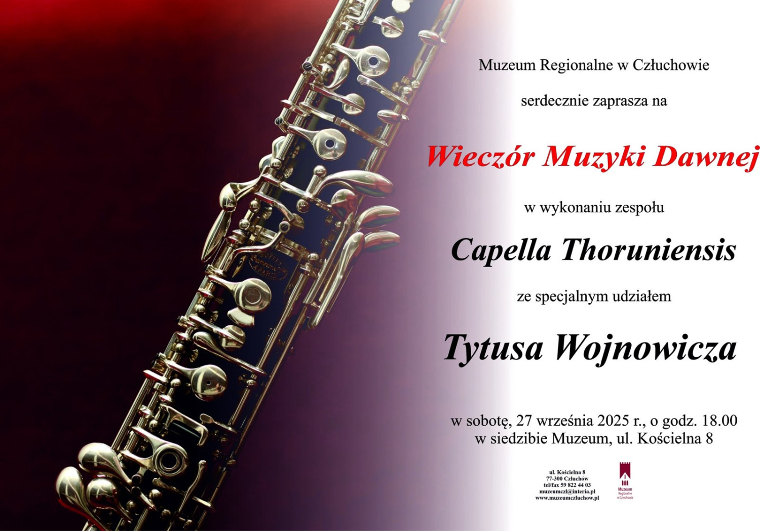 Już w najbliższą sobotę, 27 września o godzinie 18:00, w sali głównej Muzeum Regionalnego w zamku w Człuchowie odbędzie się wyjątkowy koncert zatytułowany „Wieczór Muzyki Dawnej”. Wstęp na wydarzenie jest wolny.