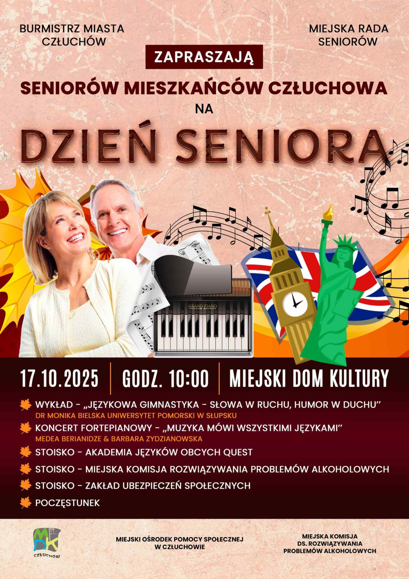 Burmistrz Miasta Człuchów oraz Miejska Rada Seniorów zapraszają wszystkich mieszkańców w wieku 60+ na uroczyste obchody Dnia Seniora, które odbędą się 17 października 2025 r. (piątek) o godz. 10:00 w Miejskim Domu Kultury w Człuchowie.