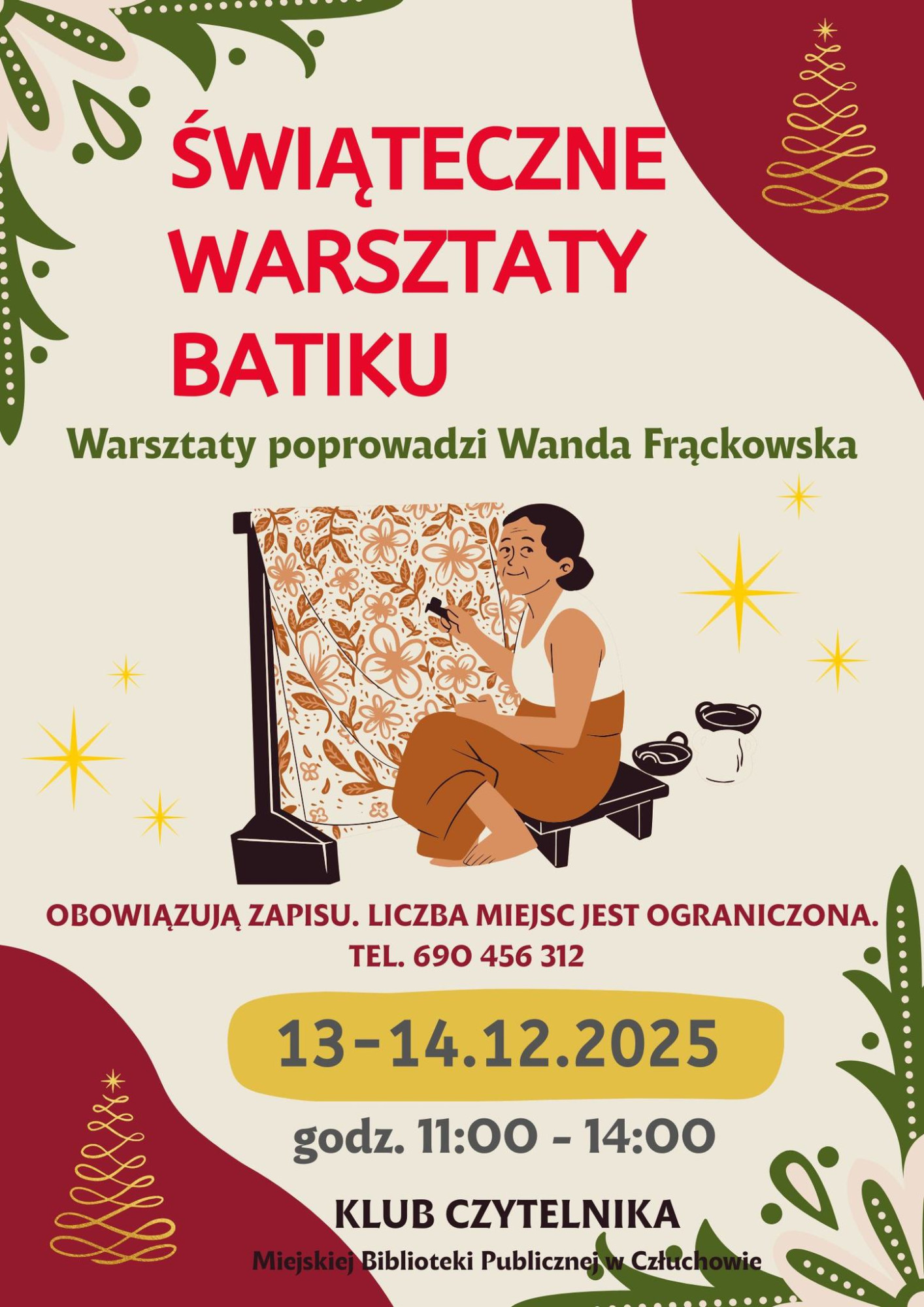 Biblioteka kontynuuje świąteczne działania i w najbliższy weekend zaprasza mieszkańców na warsztaty batiku prowadzone przez Wandę Frąckowską. Zajęcia odbędą się w dniach 13–14 grudnia 2025 roku, w godzinach 11:00–14:00 w Klubie Czytelnika.