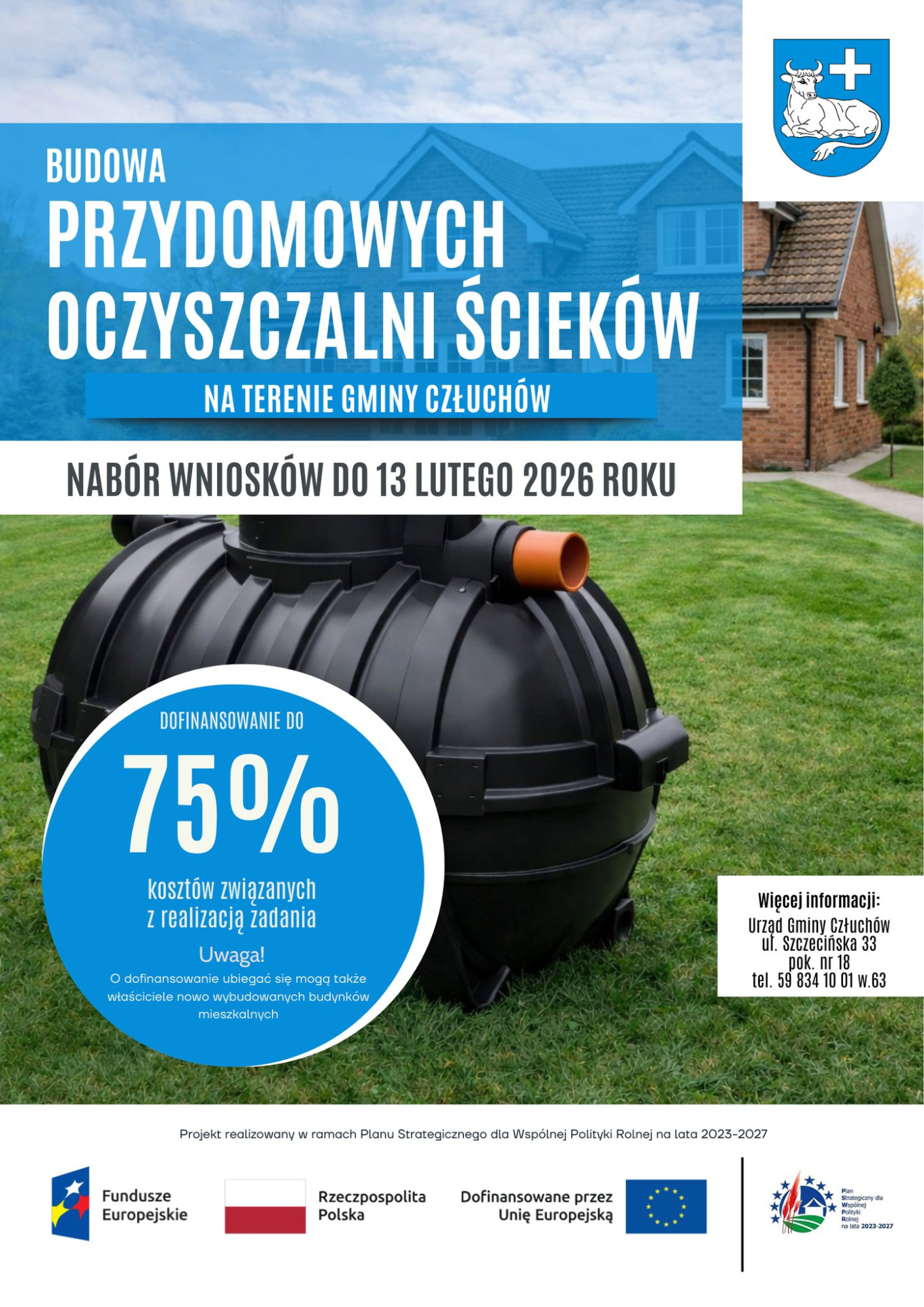 Działanie realizowane jest w ramach Planu Strategicznego dla Wspólnej Polityki Rolnej na lata 2023–2027, w zakresie infrastruktury na obszarach wiejskich, obejmującej przydomowe oczyszczalnie ścieków. Szczegółowe informacje dostępne są na stronie internetowej Urzędu Gminy w Człuchowie oraz w siedzibie urzędu.