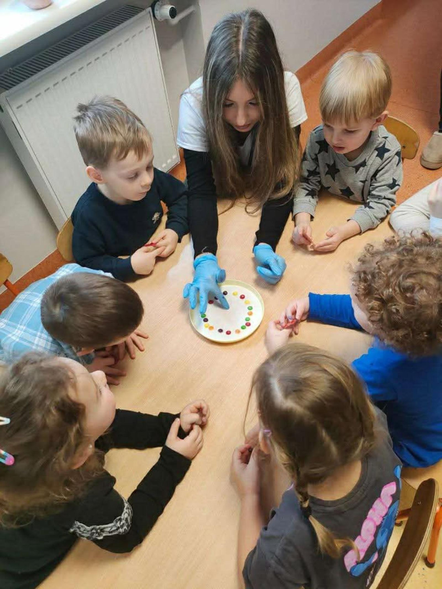 Dziś młodzież odwiedziła Przedszkole Piano, gdzie wspólnie z sześciolatkami i trzylatkami przeprowadzała proste, bezpieczne doświadczenia naukowe.