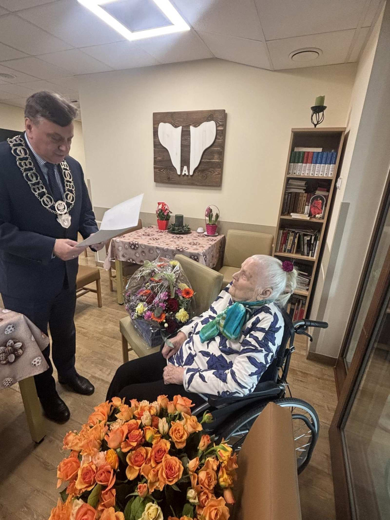 Z tej okazji jubilatkę odwiedził burmistrz Ryszard Szybajło, który złożył jej serdeczne życzenia, wręczył kwiaty oraz podkreślił znaczenie tak pięknego jubileuszu dla całej lokalnej społeczności.