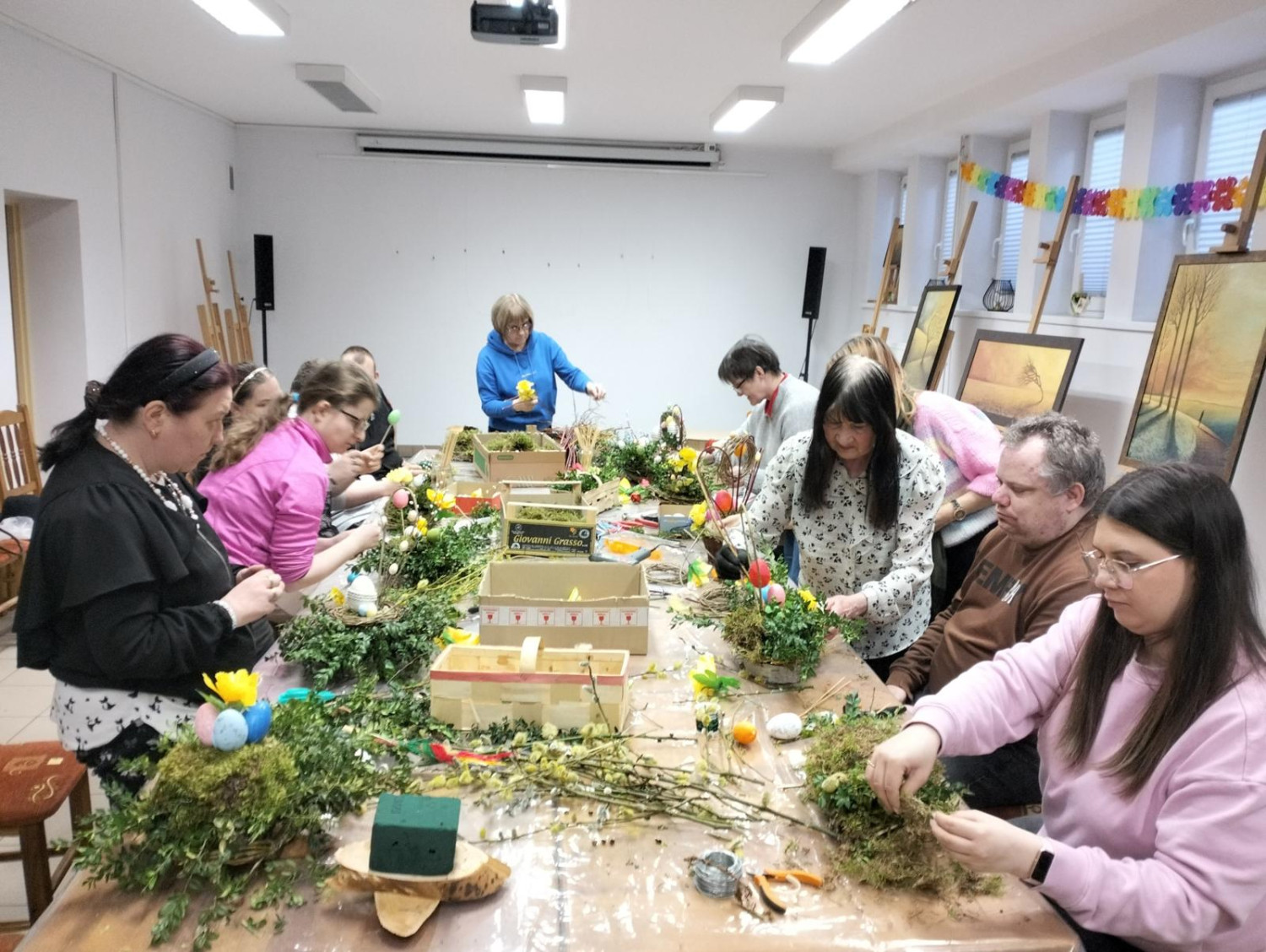 Podczas zajęć uczestnicy wykonywali wielkanocne stroiki. Warsztaty poprowadziła Stanisława Sierant, która dzieliła się swoją wiedzą i doświadczeniem. Powstałe dekoracje będą ozdobą świątecznych stołów.