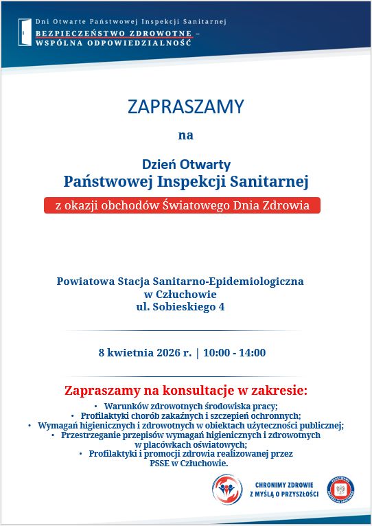 8 kwietnia 2026 roku w Człuchowie odbędzie się dzień otwarty Powiatowej Stacji Sanitarno-Epidemiologicznej. W godzinach 10:00–14:00 mieszkańcy będą mogli skorzystać z konsultacji dotyczących zdrowia i bezpieczeństwa.