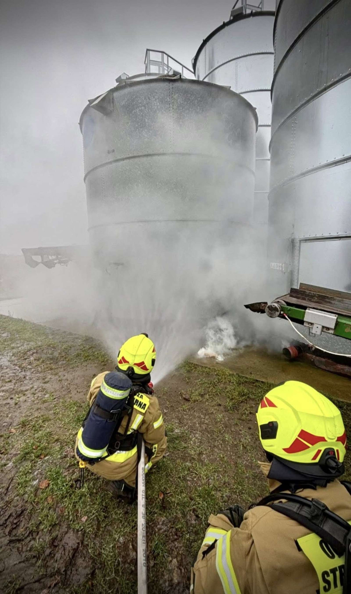 Pierwszy scenariusz dotyczył pożaru obejmującego dolną część silosów oraz przyległej hali magazynowej. Strażacy ćwiczyli rozwinięcie linii gaśniczych, właściwe zabezpieczenie terenu, prowadzenie akcji w sprzęcie ochrony dróg oddechowych oraz poszukiwanie i ewakuację poszkodowanych. Ważnym elementem była także organizacja punktu medycznego oraz zapewnienie sprawnej łączności między jednostkami.