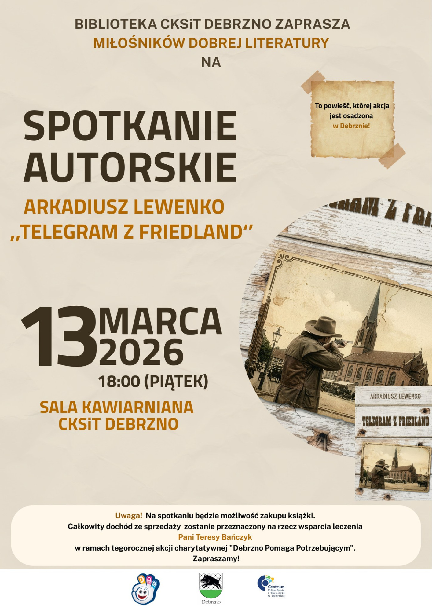 Centrum Kultury, Sportu i Turystyki w Debrznie zaprasza mieszkańców oraz miłośników literatury na spotkanie autorskie z Arkadiuszem Lewenko. Wydarzenie odbędzie się 13 marca 2026 roku.
