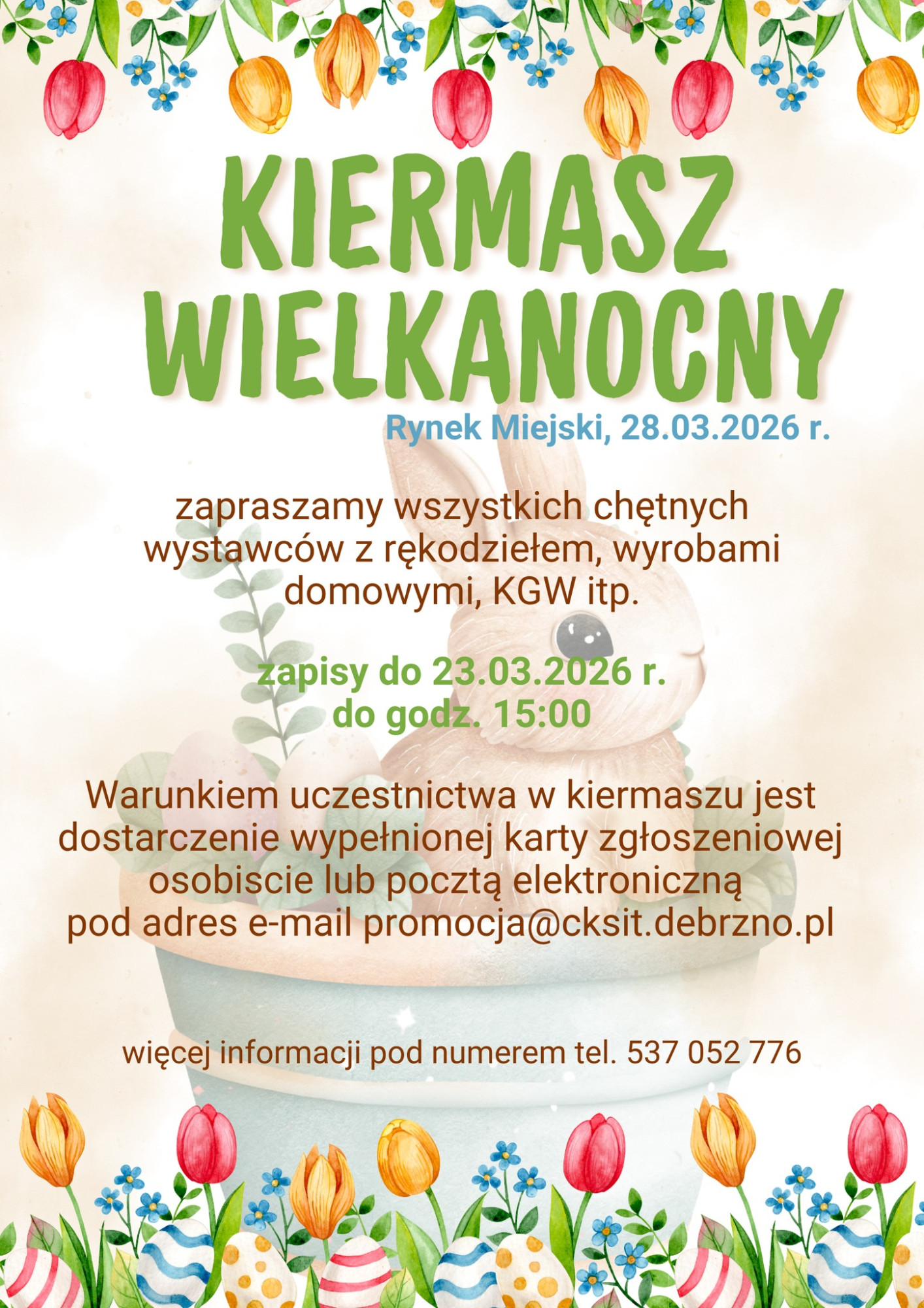 W Debrznie trwają przygotowania do Kiermaszu Wielkanocnego, który odbędzie się 28 marca 2026 roku. Organizatorzy zapraszają wystawców do udziału w wydarzeniu i zaprezentowania swoich wyrobów.