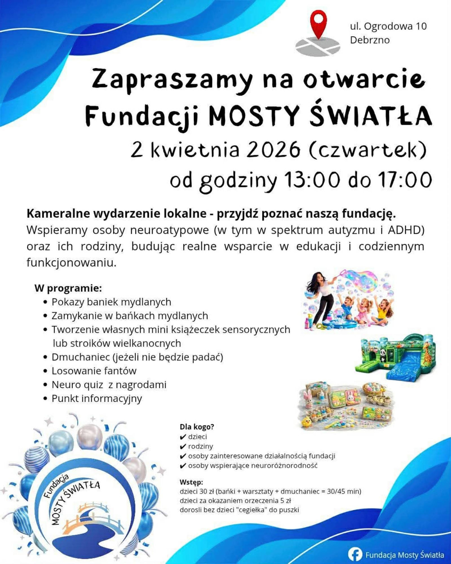 2 kwietnia 2026 roku w Debrznie odbędzie się dzień otwarty nowo powstałej Fundacji Mosty Światła. To nowa inicjatywa, która ma wspierać osoby neuroróżnorodne, w tym dzieci w spektrum autyzmu i z ADHD oraz ich rodziny.