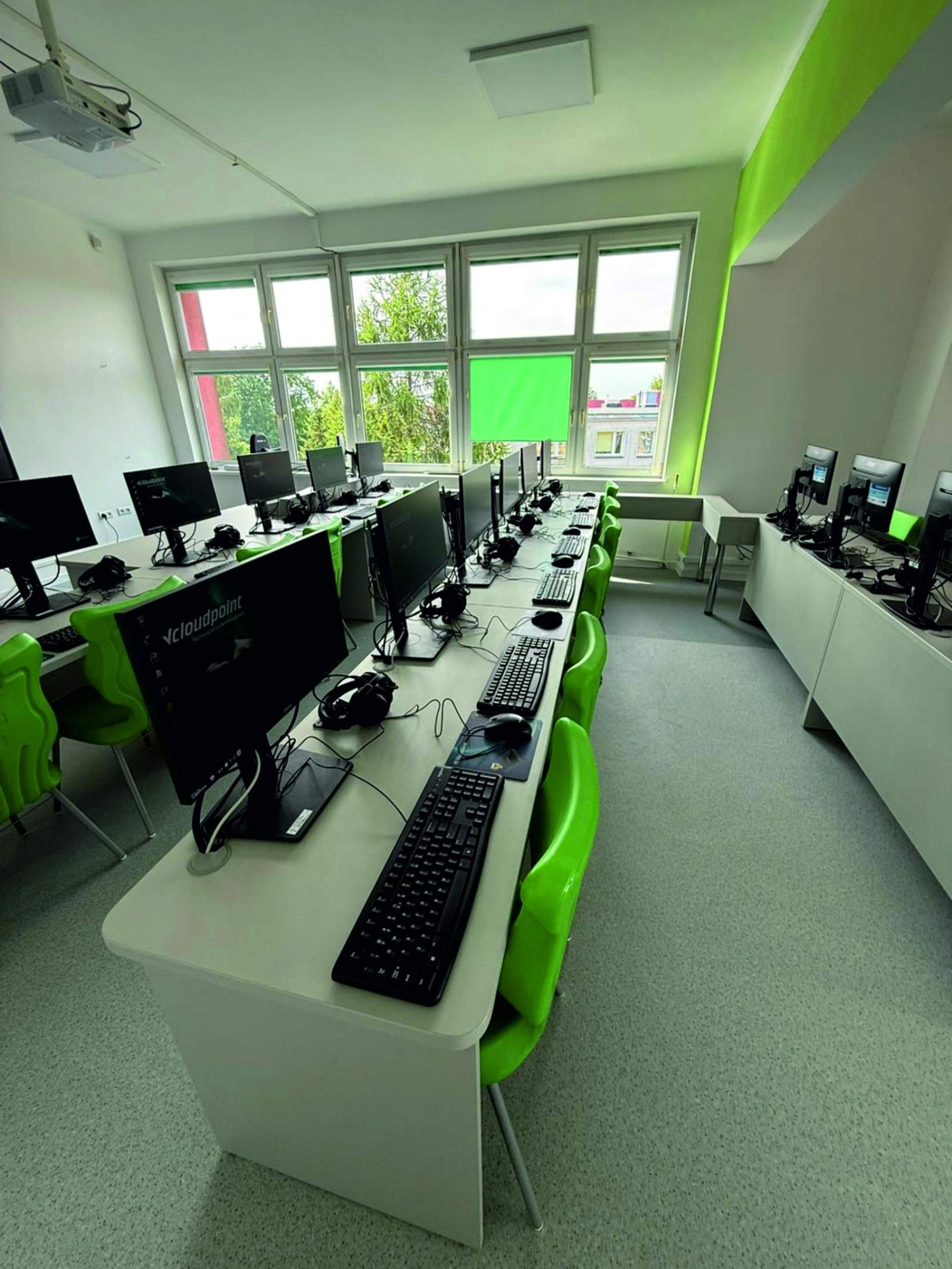 Nowa sala została wyposażona w 24 komputery dla uczniów z pulpitem językowym, oprogramowanie językowe i biurowe, serwer i stanowisko nauczyciela z możliwością kontroli pracy wszystkich uczniów, monitor interaktywny 75 cali oraz nową instalację internetową.
