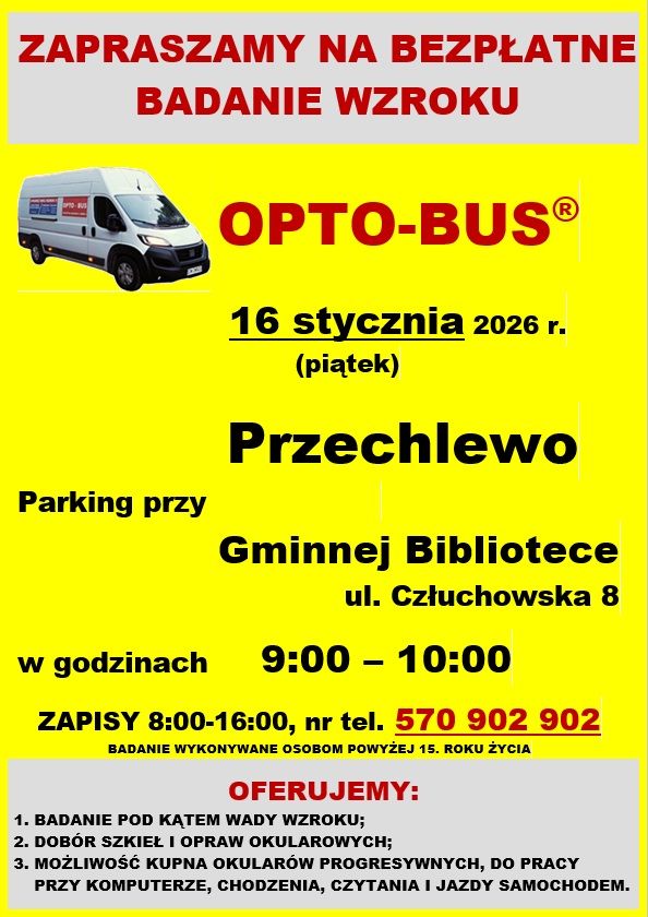 W piątek, 16 stycznia 2026 roku, na parkingu przy Gminnej Bibliotece w Przechlewie, odbędzie się bezpłatne badanie wzroku. Badanie zaplanowano w godzinach od 9:00 do 10:00. Zainteresowani proszeni są o wcześniejsze zapisy telefoniczne.