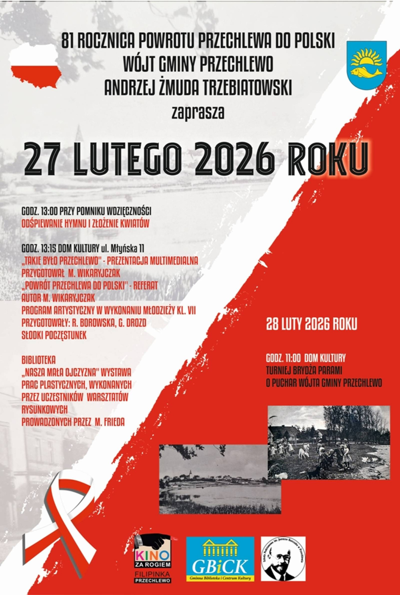 Wójt Gminy Przechlewo Andrzej Żmuda Trzebiatowski zaprasza mieszkańców do udziału w obchodach 81. rocznicy powrotu Przechlewa do Polski. Uroczystości odbędą się 27 lutego 2026 roku.