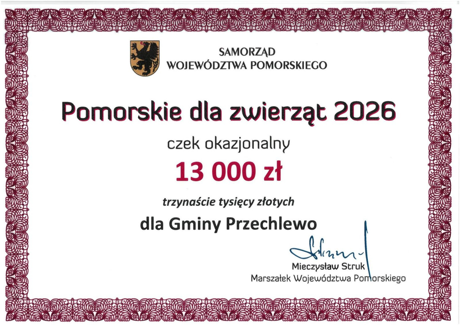 Gmina Przechlewo otrzymała 13 tys. zł dofinansowania na walkę z bezdomnością zwierząt w ramach programu „Pomorskie dla zwierząt 2026”. Z wkładem własnym samorządu daje to łącznie 26 tys. zł na działania w gminie.