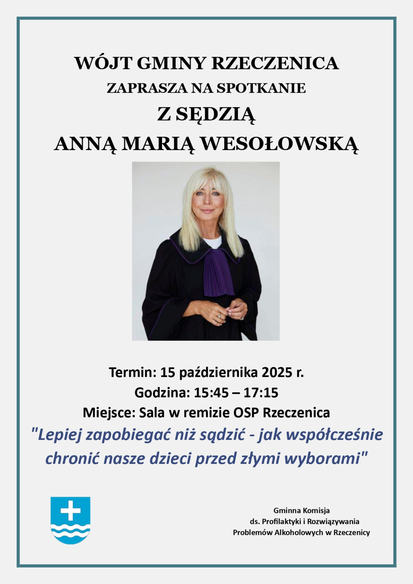 Już w środę, 15 października, znana sędzia, popularyzatorka prawa i aktorka – Anna Maria Wesołowska – odwiedzi gminę Rzeczenica. Przez cały dzień weźmie udział w serii spotkań poświęconych edukacji prawnej, bezpieczeństwu dzieci i młodzieży oraz odpowiedzialności karnej nieletnich.